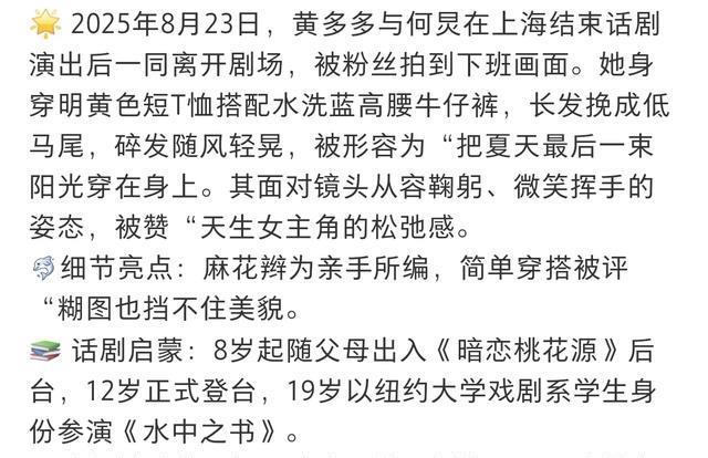 话剧里黄多多演个小女孩,导演赖声川说她不用解释就懂角色。观众拍的谢幕照片传网上后,点赞的说她有灵气,也有人说她文化课不行靠家里关系。还有人拿她以前念错字的事嘲讽,但也有人反驳说努力进圈怎么了,顶多就是观点不统一。