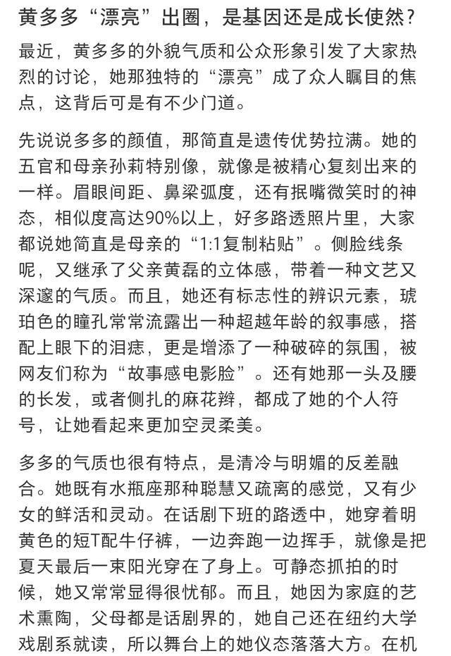 网上有说法提黄奕女儿之前闹出糗事,对比下大家更看好黄多多。毕竟人家从小有系统训练,片子也挑得不浮躁。当然也有说父母铺路的孩子不该被针对,但评论区吵吵归吵吵,该看戏的人还是会去剧场。黄多多最近的照片显示她下了台就穿得很随意,看不出当红演员架子。有粉丝说她身上有种天然的故事感,站在那就像电影画面。不过也有观众说别神话,毕竟首演总得有人捧场,后面还得看持续表现。现在她爸妈应该挺欣慰的,当年那么大的投入总算出了效果。只是没想到艺术这条路有时候还真说不准,精心培养的女儿反倒帮别人涨了人气。黄磊要是心里不平衡也没法说,毕竟好作品大家爱看,谁当红说不定谁就得当绿叶。